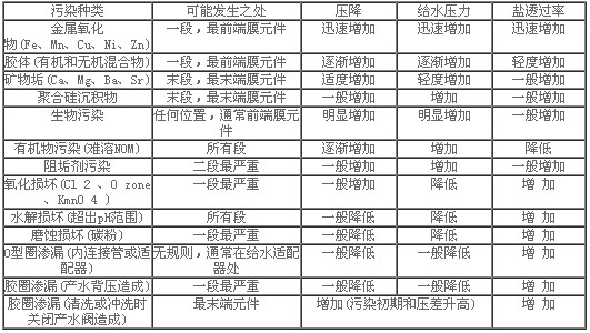 定時監(jiān)測系統(tǒng)整體性能是確認(rèn)膜元件是否已發(fā)生污染的基本方法。污染對膜元件的影響是漸進(jìn)的,并且影響的程度取決于污染的性質(zhì)。表1“反滲透膜污染特征及處理方法”列出了常見的污染現(xiàn)象和相應(yīng)處理方法。