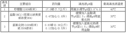表2-常規(guī)清洗液配方提供的清洗溶液是將一定重量(或體積)的化學(xué)藥品加入到100加侖(379升)的潔凈水中(RO產(chǎn)品水或不含游離氯的水)。溶液是按所用化學(xué)藥品和水量的比例配制的。溶劑是RO產(chǎn)品水或去離子水,無游離氯和硬度。清洗液進(jìn)入膜元件之前,要求徹底混和均勻,并按照目標(biāo)值調(diào)pH值且按目標(biāo)溫度值穩(wěn)定溫度。常規(guī)的清洗方法基于化學(xué)清洗溶液循環(huán)清洗一小時和一種任選的化學(xué)藥劑浸泡一小時的操作而設(shè)定的。