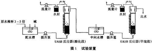 如圖1所示,本試驗采用2座結(jié)構(gòu)完全相同的UASB反應器,從上到下依次為三相分離器、懸浮層區(qū)和污泥床區(qū),有效容積為28L。沿反應器高度設(shè)置12個采樣口,反應器由夾套水保溫在35±2℃。廢水經(jīng)計量泵由底部進入酸化段UASB反應器,在頂部溢流出水,再經(jīng)中間水槽作適當調(diào)節(jié)后用計量泵打入產(chǎn)甲烷段UASB反應器。產(chǎn)氣經(jīng)水封瓶脫硫后,由濕式流量計計量產(chǎn)氣量。