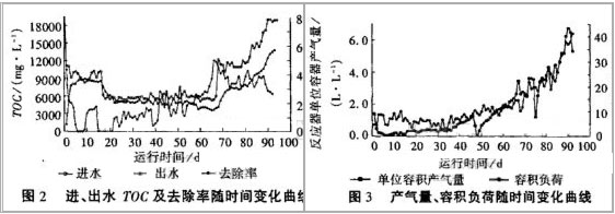 酸化段反應(yīng)器中主要發(fā)生有機(jī)物水解、酸化反應(yīng),同時(shí)絕大部分SO42-在SO42-還原菌作用下,被轉(zhuǎn)化為硫化物。在最初的16d,進(jìn)水TOC控制在10000mg/L,負(fù)荷在8kg[CODcr]/(m3•d)左右,但去除率直線下降,降低進(jìn)水TOC至6000mg/L,去除率逐步上升至16%。從第40d到79d,逐步提高負(fù)荷至12kg[CODcr]/(m3•d),去除率已達(dá)到30%以上。從第80d連續(xù)提高進(jìn)水濃度,至第88d進(jìn)水TOC達(dá)到15000mg/L,反應(yīng)器容積負(fù)荷接近30kg[CODcr]/(m3•d),去除率仍能維持在35%的較高水平,但隨著容積負(fù)荷進(jìn)一步提高到38kg[CODcr]/(m3•d),去除率明顯下降,已達(dá)到反應(yīng)器極限負(fù)荷。從產(chǎn)氣量變化曲線也可以看出,在最初48d,產(chǎn)氣量一直很低,但從第49d起產(chǎn)氣量直線上升,并且與去除率曲線具有良好的相關(guān)注。根據(jù)氣相色譜檢測(cè)結(jié)果,酸化段產(chǎn)氣經(jīng)脫硫后,CH4和CO2各占50%,證明在酸化段反應(yīng)器中,也發(fā)生了產(chǎn)甲烷反應(yīng)。