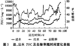 進(jìn)、出水TOC及去除率隨時(shí)間變化曲線見(jiàn)圖5。