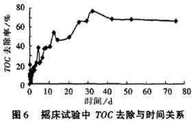 在最初的12d,進(jìn)水的TOC在6000mg/L左右,但去除率直線下降至10%,降低進(jìn)水濃度至3500mg/L左右,穩(wěn)定運(yùn)行58d,去除率在50%左右波動(dòng)。從第70d起,逐步提高進(jìn)水濃度,使負(fù)荷上升至10kg[CODcr]/(m3•d),去除率沒(méi)有明顯變化,繼續(xù)提高負(fù)荷到15kg[CODcr]/(m3•d),去除率直線下降,已達(dá)到反應(yīng)器極限負(fù)荷。根據(jù)氣相色譜檢測(cè)結(jié)果,甲烷段產(chǎn)氣中甲烷組分占73%,二氧化碳占15%,對(duì)反應(yīng)器進(jìn)出水SO42-濃度分析結(jié)果表明產(chǎn)甲烷反應(yīng)器中SO42-的去除率接近50%。經(jīng)兩相厭氧處理,SO42-累計(jì)去除率已達(dá)到85%以上。試驗(yàn)中甲烷段對(duì)有機(jī)物去除率最終穩(wěn)定在45%~60%,這與糖蜜廢水本身含有大量難降解的焦糖組分的性質(zhì)有關(guān),為進(jìn)一步探討系統(tǒng)的處理潛力,我們通過(guò)搖床試驗(yàn)來(lái)確定該種廢水在厭氧條件下的生物可降解性。
