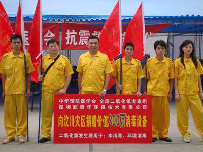 國難當頭,匹夫有責,深圳歐泰華環(huán)保技術有限公司先后于5月16日、20日分二次捐贈給四川災區(qū)共11套價值200萬元大型水消毒設備。是經(jīng)深圳市政府抗震救災辦統(tǒng)一緊急協(xié)調,由航空救災專機免費空運災區(qū),第一時間在震后飲用水消毒和防疫中發(fā)揮了重要作用。