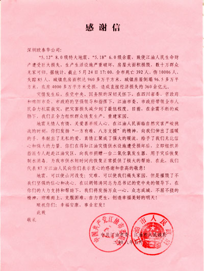江油市政府給歐泰華公司寫來感謝信