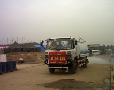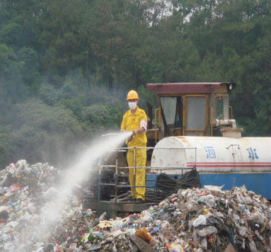 歐泰華救援服務隊員在綿陽災區(qū)垃圾場定時定點噴灑二氧化氯消毒劑