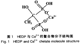 經(jīng)乙叉二麟酸與Ca2+會(huì)形成六元環(huán)型的鰲合物,結(jié)構(gòu)如圖1所示。鰲合物常常是十分穩(wěn)定的,所以水中阻垢劑存在時(shí),游離態(tài)鈣、鎂離子濃度會(huì)相應(yīng)降低。但如果將阻垢劑的用量增加至很大時(shí),其阻垢作用也無(wú)明顯的增強(qiáng),為此提出了晶體畸變機(jī)理,即在晶體生長(zhǎng)過(guò)程中,常常會(huì)由于晶體外界的一些原因,而使得晶格存在空位、錯(cuò)位等缺陷或形成鑲嵌構(gòu)造等畸變,其結(jié)果是同一晶格的各個(gè)晶面發(fā)育不等。晶體中這種局部組分的差異會(huì)導(dǎo)致晶體不穩(wěn)定,當(dāng)環(huán)境發(fā)生某些變動(dòng)時(shí),大晶體會(huì)碎裂成小晶體。