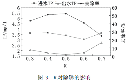 在本實驗中 , R對 6池除磷的影響見圖 3。在進水 TP濃度基本維持在 3~4 mg/ l, COD /P約為 100,進水 COD /N為 10,曝氣池 MLSS為 2000~3000的情況下 ,改變 MS BR系統(tǒng)的污泥回流比 R,出水 TP隨 R的增大出現(xiàn)先降后升的趨勢。當 R從 0 . 3增加到 0 . 5,厭氧池中污泥濃度逐漸增加 , TP去除率也逐漸增加;繼續(xù)提高污泥回流比 ,發(fā)現(xiàn) TP去除率急劇下降 ,說明污泥回流攜帶的硝酸鹽已經(jīng)嚴重影響了系統(tǒng)對磷的去除。由圖 3可知在 R為 0 . 5時工藝系統(tǒng)表現(xiàn)出相對最佳的 TP出水效果。
