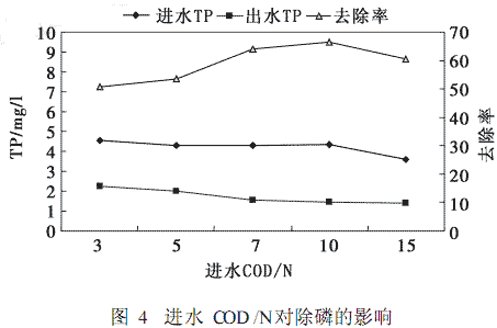 進水 COD /N對除磷的影響在本實驗中 ,進水 COD /N對 6池 MS BR除磷效果的影響如圖 4所示。進水 COD /N對磷的去除影響不是很明顯 ,隨進水 COD /N增加 ,出水 TP濃度有緩慢下降的趨勢 ,當 COD /N > 7時 ,下降趨勢趨于平緩 ,出水 TP穩(wěn)定在 1 . 5 mg/ l左右。TP去除率在COD /N從 3增加到 7時增加 , COD /N > 7時趨于穩(wěn)定。與一般脫氮除磷工藝要求進水 COD /N > 4 . 3相比 ,MS BR6池工藝要求更高的進水 COD /N比 ,這與MS BR后置反硝化的反硝化方式有關(guān) ,后置反硝化使得反硝化碳源不足 ,所以如果進水中 N含量太高(COD /N < 7) ,不充足的反硝化使大量的硝酸鹽隨污泥回流進入?yún)捬醭?,影響 PAOs的厭氧釋磷 ,并最終使系統(tǒng)除磷效果下降。