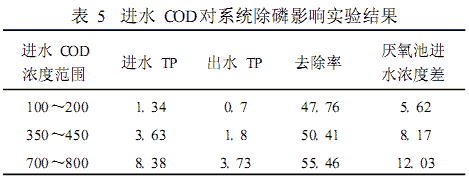 進水 COD濃度對除磷的影響維持進水中 COD /P = 100、 COD /N = 7不變 ,改變 COD濃度對去除磷的影響見表 5。