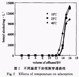 由圖2可知,溫度降低時吸附效果略有提高,這是因為苯甲醇在jx-101上的吸附是放熱的物理吸附過程。由于10~40"C范圍內(nèi)溫度對廢水處理效果影響并不大,考慮到經(jīng)濟(jì)簡便,室溫下吸附即可。