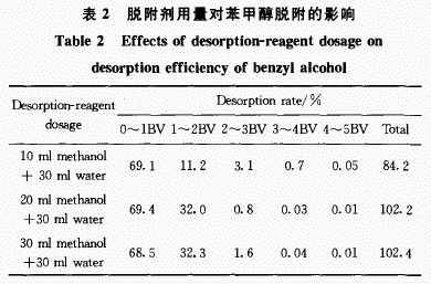 (1)脫附劑及用量對脫附的影響苯甲醇與甲醇、乙醇、乙醚、丙酮、氯仿等互溶,考慮到甲醇成本相對較低,且易與苯甲醇分離,故選擇甲醇為脫附劑。在溫度為40℃ 、流量為1 BV •h-1的條件下,用甲醇和水對樹脂進(jìn)行解析,不同脫附劑用量對應(yīng)的苯甲醇脫附率見表2。
