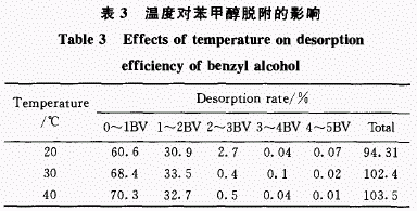 (2)脫附溫度對脫附的影響 脫附劑為2 BV甲醇+3 BV水、脫附流量為1 BV •h 的條件下,不同溫度對應(yīng)的苯甲醇脫附率見表3。