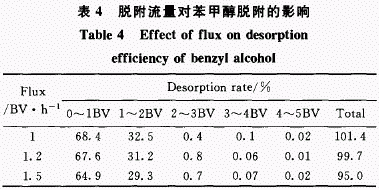 (3)脫附流量對脫附的影響 脫附劑為2 BV甲醇+3 BV水、溫度為30℃ 的條件下,不同脫附流量對應(yīng)的苯甲醇脫附率見表4。
