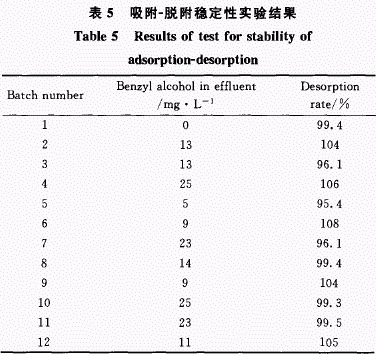 由表4可知,流量降低時脫附率有所提高,因為流量低時苯甲醇的擴(kuò)散和溶解過程長、脫附更加充分。從表中可以看到,流量小于1.2 BV •h -1時脫附率接近100 ,考慮到脫附效果和吸附一脫附時間的均衡,選擇脫附流量為1.2 BV•h-1。