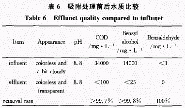 由表5可知,出水苯甲醇含量低于25 mg•L-1,脫附率接近100 ,樹脂吸附一脫附運(yùn)行穩(wěn)定可靠、樹脂機(jī)械強(qiáng)度良好。分析所有批次出水的平均水質(zhì),進(jìn)、出水水質(zhì)比較見表6,由表6可見,出水無色透明,COD、苯甲醇、苯甲醛的去除率均超過99%,出水達(dá)到國家一級排放標(biāo)準(zhǔn)。