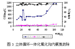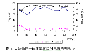 試驗研究和應用的結果表明,能夠同時有效地去除污水中的有機污染物和氮。COD去除率達到95%,BOD 去除率為98%。NH3-N去除率達到99%,總氮去除率90%以上。試驗運行結果見圖2 ~ 圖4。
