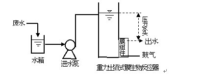 新型重力出流式膜生物反應器利用反應器內液位水頭、采用重力驅動出水,省去傳統(tǒng)的出水抽吸泵及復雜的氣或水反沖洗設備,低水頭連續(xù)過濾出水,既保留傳統(tǒng)一體式MBR水處理效率高等優(yōu)點,又可提高膜通量,降低膜污染。整個系統(tǒng)結構緊湊,投資少,操作簡便。該項技術已申請專利(發(fā)明專利申請?zhí)枺?1120586.5)。重力出流式膜生物反應器工藝系統(tǒng)如圖5所示。