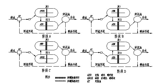 西安市北石橋污水凈化中心是西北地區(qū)規(guī)模較大的一座現(xiàn)代化污水處理廠,總服務(wù)面積53.5Km2,規(guī)劃人口60萬人。該中心引進國外DE型氧化溝工藝,一期規(guī)模15萬m3/d,始建于1994年10月,1998年5月投入試運行。運行以來出水水質(zhì)穩(wěn)定、運行平穩(wěn)。運行方式如下圖: