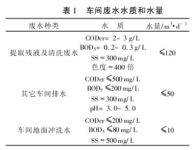 湘西自治州某制藥有限公司是生產(chǎn)中藥提取物、中成藥和中藥制劑的中藥專業(yè)生產(chǎn)廠。工廠廢水主要來自原藥箭汁與提取的工藝殘液、工藝設(shè)備和管道沖洗廢水及車間地面沖洗水等;由于工藝生產(chǎn)為非連續(xù)操作,廢水的水質(zhì)和水量變化大,廢水中含有各種天然有機污染物,且因在不同時期生產(chǎn)不同的中藥提取物而導(dǎo)致廢水水質(zhì)出現(xiàn)較大的差異;其主要成分大多含有木質(zhì)素、色素、生物堿、甙、多糖、蹂質(zhì)、蒽醌類物質(zhì)及其它水解產(chǎn)物等污染物,廢水中污染物的濃度較高。工廠廢水的水質(zhì)水量見表1。