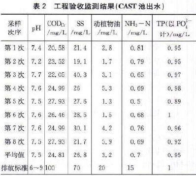 該工程調(diào)試、運行正常后,經(jīng)大連市環(huán)保局沙河口分局環(huán)境監(jiān)測站隊系統(tǒng)出水進行了監(jiān)測,并通過驗收。驗收監(jiān)測結(jié)果見表2。