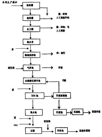 本方案采用粗、細格柵-+水力篩-+沉砂隔油-+氣浮-+水解酸化-+SBR-+過濾-+消毒的處理工藝。