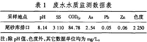 治理前廢水水質(zhì)監(jiān)測結(jié)果列于表1。該廢水為尾礦庫溢流水,由于在選礦過程中加了硅酸鈉(一種強(qiáng)分散劑)使礦漿中的微細(xì)泥塵形成一個很穩(wěn)定的膠體分散系,在自然狀態(tài)下即使靜置半個月,該廢水也不會澄清。該廢水外觀呈米湯色、渾濁,其主要污染因子為SS、As、COD,尤以SS、As為甚。要求處理后廢水達(dá)到污水綜合排放標(biāo)準(zhǔn)《GB8978-1996》一級標(biāo)準(zhǔn)。