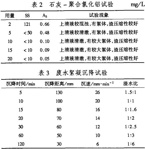 從試驗(yàn)結(jié)果可以看出,該絮凝渣較易沉降。由于原水SS含量高,加入石灰和絮凝劑反應(yīng)后5min,廢水中的絮體即迅速沉降,前15min的沉降速度較快,As和SS含量隨之迅速減少,20wan以后,沉降速度轉(zhuǎn)慢,基本屬于減速沉降;60min以后,進(jìn)入壓縮沉降階段,渣水比為1:3,2h后渣水比為1:6。
