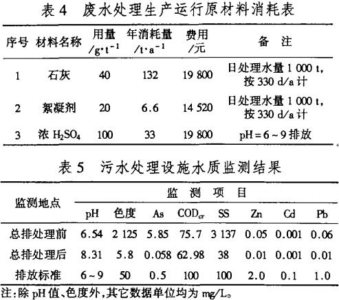 廢水處理生產(chǎn)運(yùn)行材料消耗明細(xì)列于表4。整個工程投資約30萬元,年運(yùn)行費(fèi)用不超過6萬元。2004年l0月,當(dāng)?shù)丨h(huán)境監(jiān)測部門對該廢水治理設(shè)施進(jìn)行了驗(yàn)收監(jiān)測,結(jié)果顯示其主要污染因子SS<50mg/L、As<0.01mg/L、色度5.8,遠(yuǎn)遠(yuǎn)低于污水綜合排放標(biāo)準(zhǔn)((GB8978-l996》一級標(biāo)準(zhǔn)。監(jiān)測結(jié)果列于表5。