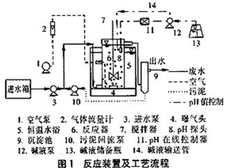 廢水經(jīng)由進(jìn)水泵從水箱中提升進(jìn)入反應(yīng)器底部,經(jīng)反應(yīng)后從出水口進(jìn)到沉淀池中,沉淀后的上清液排走,污泥則經(jīng)污泥泵回流進(jìn)入反應(yīng)器底部?諝馔ㄟ^氣泵,經(jīng)氣體流量計(jì)控制氣量后進(jìn)入反應(yīng)器。反應(yīng)器置于恒溫水浴[(35±1)℃]中。試驗(yàn)中采用了pH在線控制,通過自動(dòng)投加Na2CO3溶液將pH值控制在7.0~7.8。