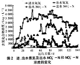 整個(gè)運(yùn)行過程中進(jìn)、出水氨氮濃度及出水NO2-N和NO3-N濃度的變化如圖2所示。