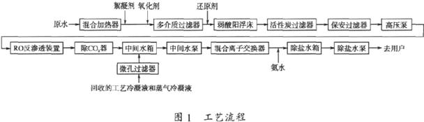該裝置的補給水處理采用離子交換軟化+反滲工藝流程,該裝置的補給水處理采用離子交換軟化反滲透混床工藝,其工藝流程見圖1。