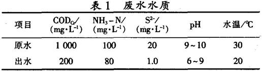 廢水水質(zhì)見表1。經(jīng)處理后廢水達(dá)到GB13458-1992《合成氨工業(yè)水污染物排放標(biāo)準(zhǔn)》二級標(biāo)準(zhǔn),排入市政污水干管中。