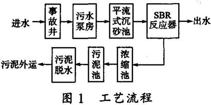 設(shè)計日處理污水量為2500m3。設(shè)計變化系數(shù)為1.5,設(shè)計秒流量為50L。采用SBR生物處理工藝處理污水,工藝流程見圖1。