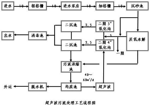 如上圖所示,為超聲波污泥處理設(shè)備在城北污水處理廠工藝流程。首先城北污水處理廠二期兩條線是平行的獨(dú)立運(yùn)行單元,兩條線的設(shè)計(jì)規(guī)模相同,運(yùn)行的進(jìn)水和工況條件基本相同,具有很好的可比性。