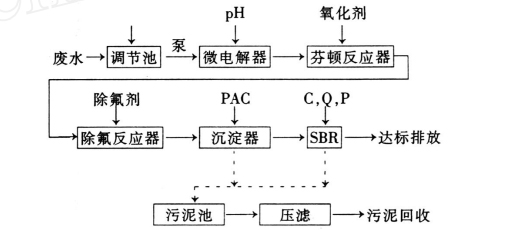根據(jù)該含氟廢水的特性,其氟化物質(zhì)量濃度在80~100 mg/L左右,pH值在6~8范圍之間。利用微電解器與芬頓反應(yīng)器使廢水中的有機(jī)氟斷鏈,提高其可生化性,在除氟反應(yīng)器中與石灰均勻反應(yīng)生成氟化鈣,并通過(guò)沉淀,從而大大降低氟化物在廢水中的質(zhì)量濃度。由于廢水中含有一定量雜質(zhì),反應(yīng)后的沉淀顆粒細(xì)小,沉降速率緩慢。為提高沉降速率,在沉淀階段加人絮凝劑PAC來(lái)增大沉淀物的顆粒,使沉淀速率明顯加快。經(jīng)1~2 h后的自然沉淀,上層清液的送至SBR池進(jìn)行生化處理后,水質(zhì)達(dá)到了國(guó)家排放標(biāo)準(zhǔn)。