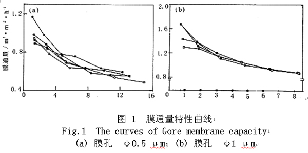 由圖1可見,0.5 μm和1 μm的戈?duì)柋∧V料在前5 min的平均膜通量分別為0.8 m3/(m2*h)和1.2 m3/(m2*h),以后膜通量減小,曲線趨于平緩,但每次反吹脫泥餅后仍可恢復(fù)良好膜通量特性,這是因?yàn)樵摓V料采用戈?duì)枌S械呐蝮w聚四氟乙烯薄膜制造技術(shù)制成的。具有表面摩擦因數(shù)低,單位膜面積成孔率高等特性,能始終保持較低過濾阻力和較高膜通量。因此,用戈?duì)柋∧V料處理含氟廢水,膜孔選用0.5 μm,設(shè)計(jì)單位處理量0.8 m3/(m2*h),過濾壓力0.08~0.10 MPa,過濾周期每5 min設(shè)定反吹一次。