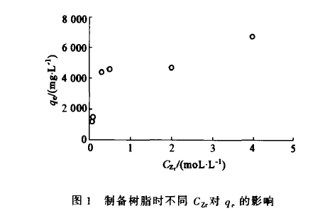 制備負(fù)載樹脂的過程中,在相同的實(shí)驗(yàn)條件下選用不同的鋯濃度條件制備負(fù)載樹脂.所得的樹脂分別用于進(jìn)行靜態(tài)吸附試驗(yàn),得到在C一:0.1mol/L時(shí)各樹脂的平衡吸附量q.圖l列出了制備負(fù)載樹脂時(shí)不同鋯濃度對(duì)q的影響.當(dāng)鋯的濃度為0.08、0.1、0.3、0.5mol/L時(shí),q依次明顯增加.當(dāng)鋯的濃度為2、4mol/L時(shí),q增加不顯著.考慮到實(shí)際操作成本以及藥品過量時(shí)會(huì)造成浪費(fèi),在制備負(fù)載樹脂時(shí),選擇鋯的濃度為0.5mol/L。