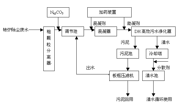 對(duì)轉(zhuǎn)爐除塵廢水處理的沉淀效率、水質(zhì)穩(wěn)定、污泥回收等幾個(gè)方面的考慮,以實(shí)現(xiàn)穩(wěn)定的水閉路循環(huán)為目的,典型工藝流程如下: