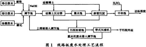 改造后的線路板廢水處理工藝流程如圖1所示。絡(luò)合廢水和油墨廢水分別經(jīng)過破絡(luò)和酸化處理后,與其他酸堿、含銅等綜合廢水一起經(jīng)收集管道輸送到調(diào)節(jié)池,氣體攪拌混合,調(diào)節(jié)水質(zhì)水量,同時(shí)投加NaOH調(diào)節(jié)pH。調(diào)節(jié)池廢水經(jīng)泵提升進(jìn)人硅藻土反應(yīng)器,投加硅藻精土凈水劑進(jìn)行混凝沉淀,去除金屬離子、懸浮物以及部分有機(jī)物,反應(yīng)器出水進(jìn)人集水池,再泵人斜管沉淀池,利用硅藻精土凈水劑或硅藻土反應(yīng)器排放污泥進(jìn)行混凝沉淀,進(jìn)一步吸附去除水體中的金屬離子,沉淀池出水進(jìn)人中和池調(diào)節(jié)pH后達(dá)標(biāo)排放。硅藻土反應(yīng)器和斜管沉淀池排放污泥經(jīng)濃縮和帶式壓濾機(jī)脫水后外運(yùn)至專門的固廢處理站處理。