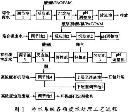 (1)污水系統(tǒng)各項(xiàng)廢水處理工藝見(jiàn)圖1。