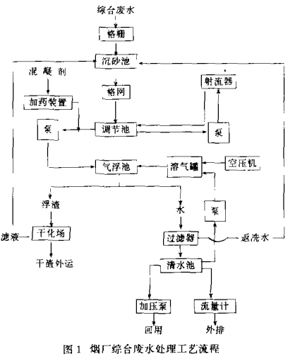 氣浮對廢水中的懸浮物和油類有很高的去除率,為獲得更好的效果,在氣浮出口處又加了一個重力式無閥濾池,起把關(guān)作用。氣浮池刮出來的浮渣自流入干化場,干渣定期外運。考慮到廢水中有部分辦公室生活污水,在調(diào)節(jié)池內(nèi)安裝了射流曝氣裝置,目的防治懸浮物在調(diào)節(jié)池沉積,同時也可去除部分BOD。經(jīng)過處理后的水完全達標,部分外排,部分返回鍋爐房除塵、沖渣及冷卻補充水。