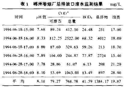 對郴州卷煙廠廢水總排放口進行了多次連續(xù)監(jiān)測,其結(jié)果列于表1中。從表1可看出,總排放口廢水中BOD/COD的均值僅為0.054,而可溶解的COD只占COD總量的10.31%。結(jié)果表明,郴州卷煙廠綜合廢水的可生化性差,COD含量雖高,但可溶解的少,COD反映出廢水中含有大量煙末和植物油類,因此采用物理化學(xué)方法來處理卷煙廠綜合廢水。