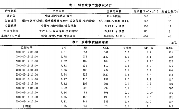 某卷煙廠2004年生產(chǎn)卷煙60萬箱,全廠生產(chǎn)車間洗滌水、設(shè)備及地面沖洗水以及生活污水總量約為1000m3/d,全部納入污水處理站集中處理。其卷煙生產(chǎn)過程中產(chǎn)生的廢水主要來源及水質(zhì)狀況如表1表2所示。