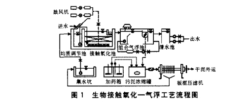 根據(jù)水質(zhì)特點,該卷煙廠采用生物氧化接觸法處理廢水。接觸氧化池有效水深為4.5m,池中采用纖維填料,填料層厚度為2.7m,穿孔曝氣管采用不銹鋼材質(zhì)。廢水經(jīng)生物接觸氧化池生化處理后進(jìn)入氣浮池進(jìn)行固液分離,氣浮處理后的出水經(jīng)中間水箱后由泵抽排。流程如下: