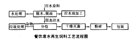 餐飲廢水中往往含有較多固態(tài)廢棄物,可以用來(lái)再生做飼料。經(jīng)集中收集的衛(wèi)生、新鮮的城市餐飲廢水,首先將其作脫水、脫油處理,然后對(duì)固態(tài)成分進(jìn)行干燥滅菌,再通過(guò)機(jī)械加工生產(chǎn)出固體飼料,簡(jiǎn)單流程見(jiàn)下圖。