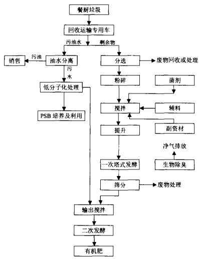 餐廚垃圾用回收專用車收集、運(yùn)輸至處理系統(tǒng),首先進(jìn)行分選,取出少量混入餐廚垃圾中,不宜做堆肥發(fā)酵的瓶罐塑料等固體廢棄物,然后把剩余物進(jìn)行粉碎,并添加一定量的菌劑、 輔料及副資材進(jìn)行攪拌提升至發(fā)酵塔內(nèi)。物料在發(fā)酵塔內(nèi)進(jìn)行一次發(fā)酵,以達(dá)到無害化、減量化的目的。