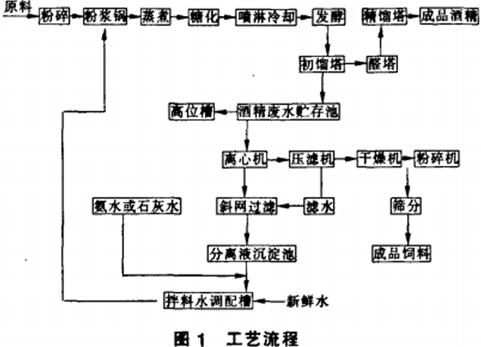 酒精廢水回收工藝流程見圖l。由圖l可知,原酒精生產(chǎn)工藝不變,只是把初餾塔排出的酒精廢水用離心機進行水分離。濾渣(含水率70%、經(jīng)過壓濾、干燥、粉碎、篩分即可加工成千飼料:濾液經(jīng)過濾、自由沉淀、調(diào)配后作粉碎工序拌料用水,循環(huán)使用。