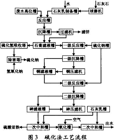 冶煉煙氣制酸所產(chǎn)生的廢水或廢酸中,除了含有高砷、氟外,還有一些有色金屬。為了回收砷及重金屬,在廢水或廢酸中加入含硫的鹽類,如硫化鈉、硫氫化鈉、硫代硫酸鈉及硫化鐵等等,與砷及銅、鉍等重金屬進行反應(yīng),生成硫化物沉淀,達到除砷和回收重金屬的目的。硫化法酸性污水除砷流程見圖4,其反應(yīng)如下: