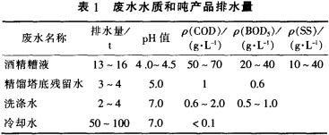 酒精生產(chǎn)的廢水主要來(lái)自蒸餾發(fā)酵成熟醪后排出的酒精糟液。生產(chǎn)設(shè)備的洗滌水、沖洗水。以及蒸煮、糖化、發(fā)酵、蒸餾工藝的冷卻水等。排放廢水水質(zhì)和噸產(chǎn)品排水量見(jiàn)表1。