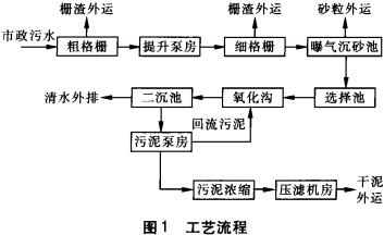 焦作市污水處理廠一期工程設(shè)計(jì)規(guī)模為10×104m3/d,遠(yuǎn)期設(shè)計(jì)規(guī)模為25×104m3/d。一期工程建設(shè)利用法國(guó)政府混合貸款,全廠設(shè)備均為法國(guó)進(jìn)口設(shè)備,采用改良型Carrousel氧化溝工藝,分為預(yù)處理、生化處理、污泥處理三部分。出水水質(zhì)執(zhí)行《城鎮(zhèn)污水處理廠污染物排放標(biāo)準(zhǔn)》(GB18918-2002)二級(jí)標(biāo)準(zhǔn),產(chǎn)生的污泥不經(jīng)消化直接進(jìn)行機(jī)械脫水。具體工藝流程見圖1。